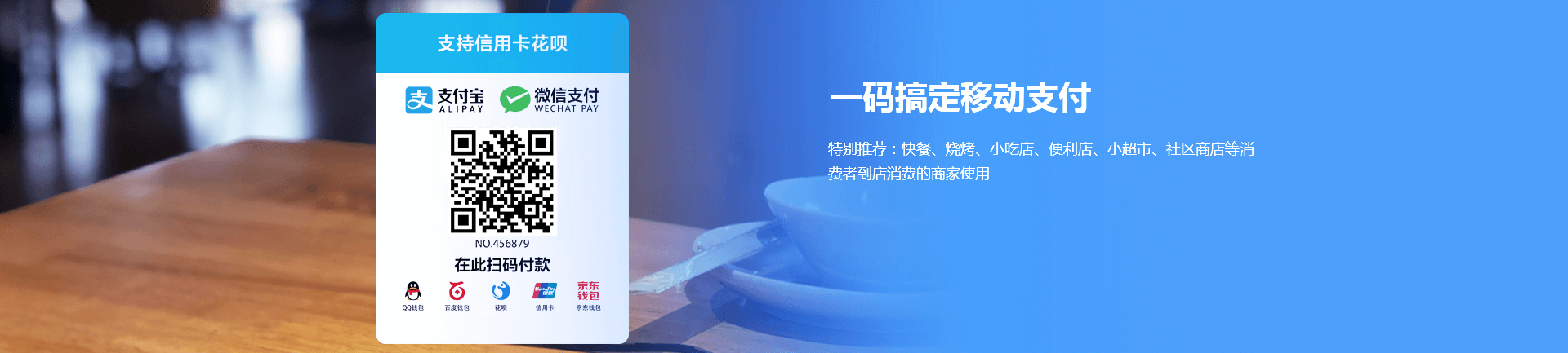 收款码台卡可放置于收银台,也可拿到顾客面前完成收款,收款码贴纸可张贴于店铺各处收款